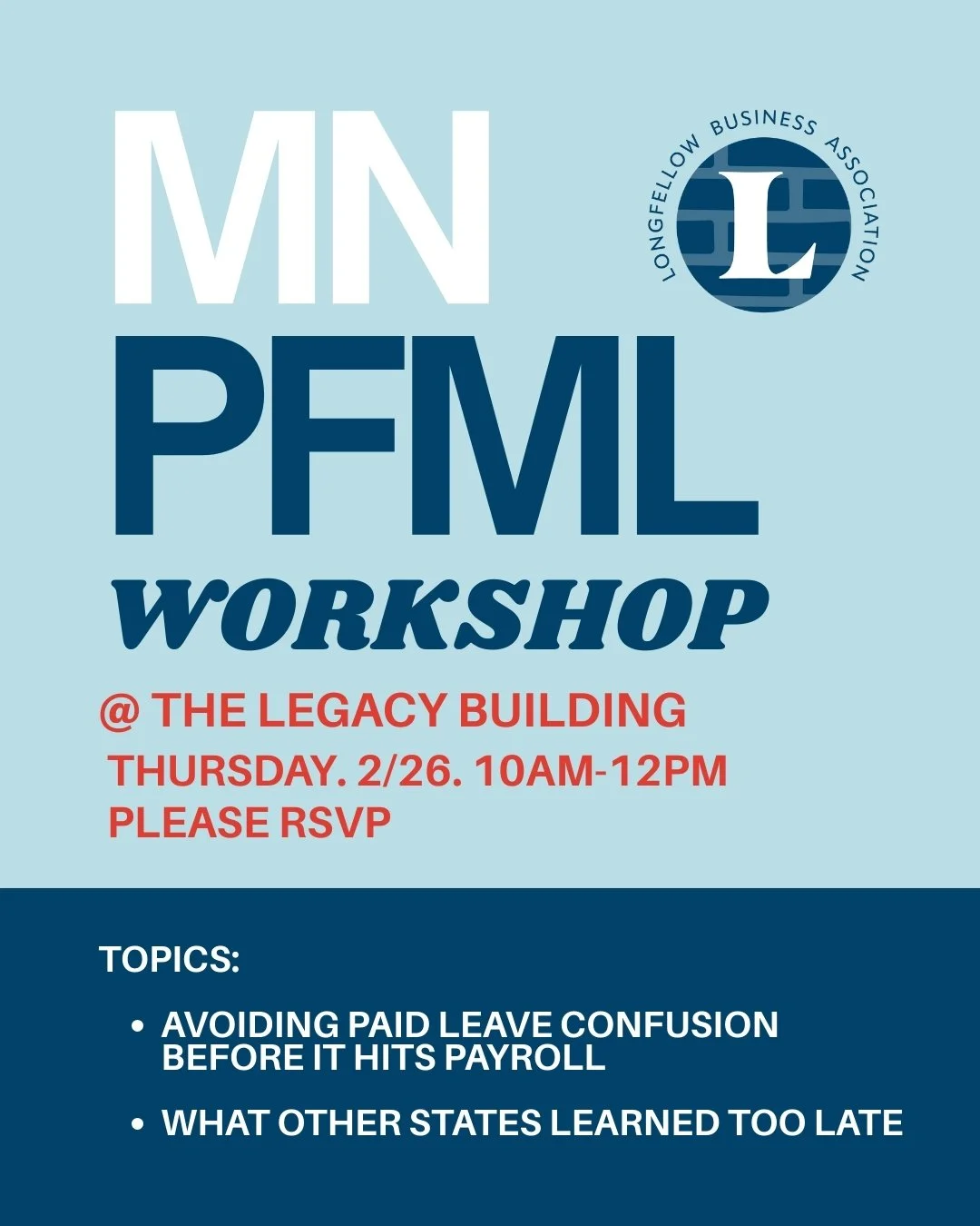 Join us Thursday, February 26 at the Legacy Building for a practical workshop designed to help small business owners understand Minnesota’s Paid Family and Medical Leave before confusion sets in. We’ll cover what other states learned the hard way, what actually shows up on payroll, how to talk with employees confidently, and how to prepare without creating extra work or stress. This session is about clarity, not compliance panic, and making sure you feel informed, supported, and ready as these changes roll out.elated to unhoused neighbors, recent ICE activity and guidance, and space for additional questions from attendees. This is an opportunity to hear directly from City leadership, share what you’re seeing on the ground, and be part of a constructive, solutions-focused conversation.